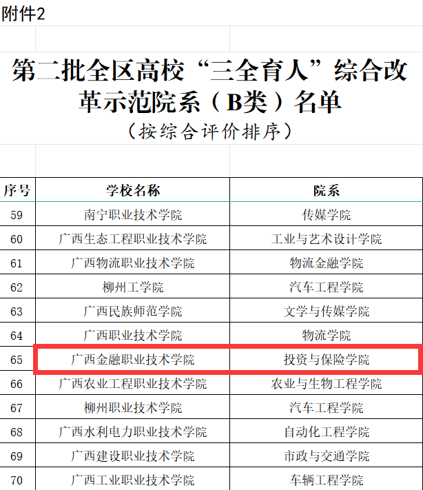 据悉,自治区高校“三全育人”综合改革示范院系评选根据《自治区教育厅办公室关于开展第二批全区高校“三全育人”综合改革示范院系等级认定工作的通知》(桂教办〔2023〕1117号),经高校推荐、专家审议、结果公示等程序而最终确定,旨在以习近平新时代中国特色社会主义思想为指导,坚持和加强党对教育的全面领导,落实立德树人根本任务,推动构建全员协同、全程覆盖、全方位渗透、职业教育特色突出的育人体系,形成思想价值引领贯穿教育教学全过程和各环节的长效机制。