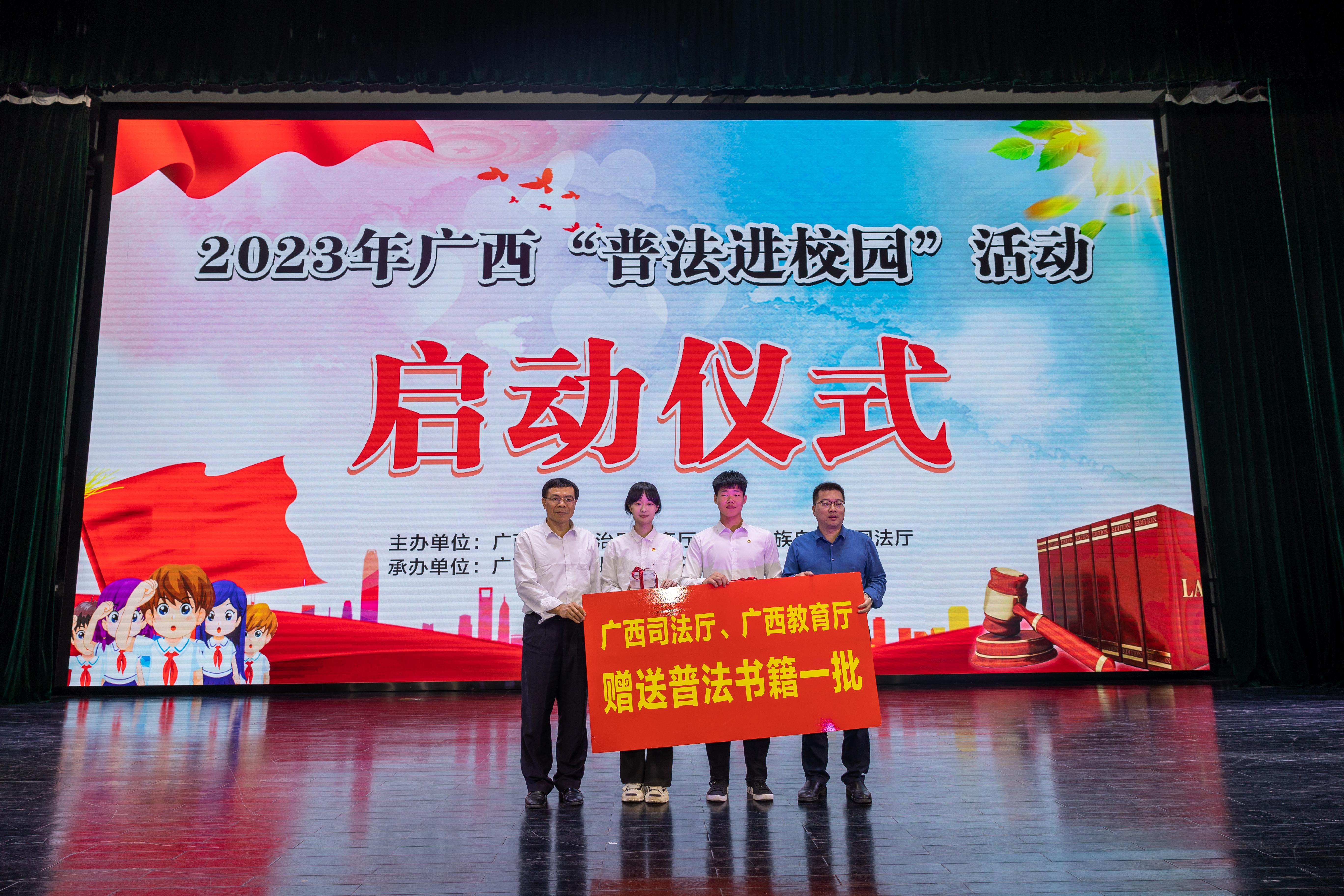 自治区教育厅政策法规处李辉善处长宣布活动启动。启动仪式上,伟德官网党委书记李高岩宣读尊法守法倡议书;李辉善处长和陆建武处长向学生代表赠送普法书籍;参会领导为普法志愿者颁发绶带,并与志愿者合影留念。