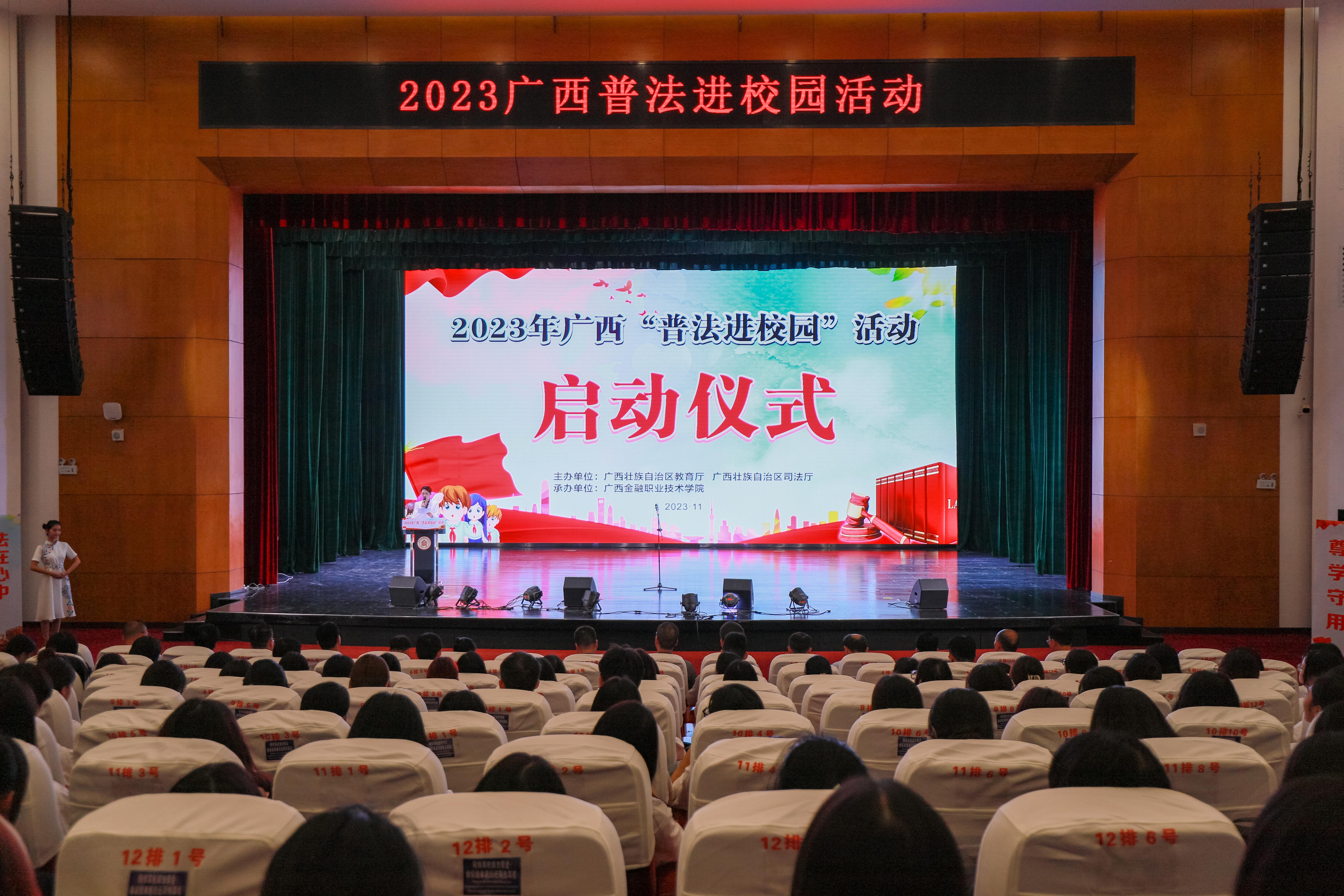 为全面学习贯彻党的二十大精神,营造尊法、学法、守法、用法的良好法治浓厚氛围,推动青少年法治教育常态化长效化,11月23日下午,由自治区教育厅、自治区司法厅主办,广西广播电视台承办、广西职业技术学院等10所中高职学校协办的2023年“普法进校园”主题活动启动仪式在伟德官网西校区国际会议中心成功举办。自治区教育厅政策法规处处长李辉善、自治区司法厅普法与依法治理处处长陆建武、广西广播电视台青少年普法栏目组人员、协办单位学校代表等出席启动仪式。