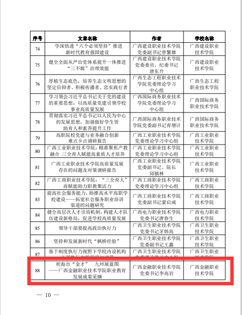 近日,自治区党委教育工委公布2023年度广西高校党委理论学习中心组优秀学习品牌和优秀理论(调研)文章,伟德官网党委书记李高岩理论文章《桂海出“金才” 九州展蓝图——伟德国际victor1946职业教育发展成果采撷》获评优秀理论(调研)文章。