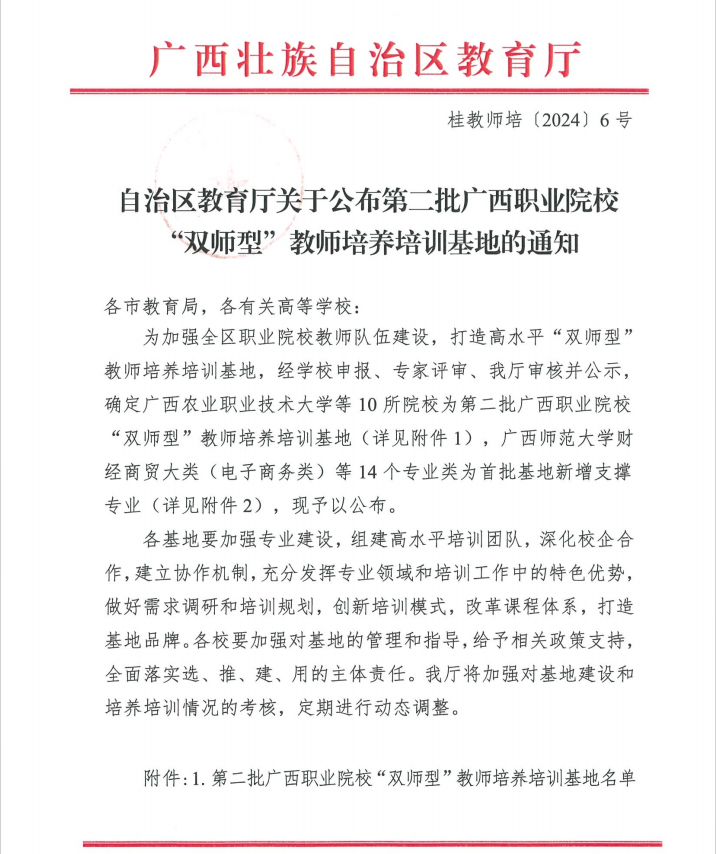 近日,自治区教育厅印发《关于公布第二批广西职业院校“双师型”教师培养培训基地的通知》(桂教师培﹝2024﹞6号),经专家评审、自治区教育厅审核遴选并公示无异议后,伟德官网成功入选第二批广西职业院校“双师型”教师培养培训基地,支撑专业为财经商贸大类的金融类和财务会计类。