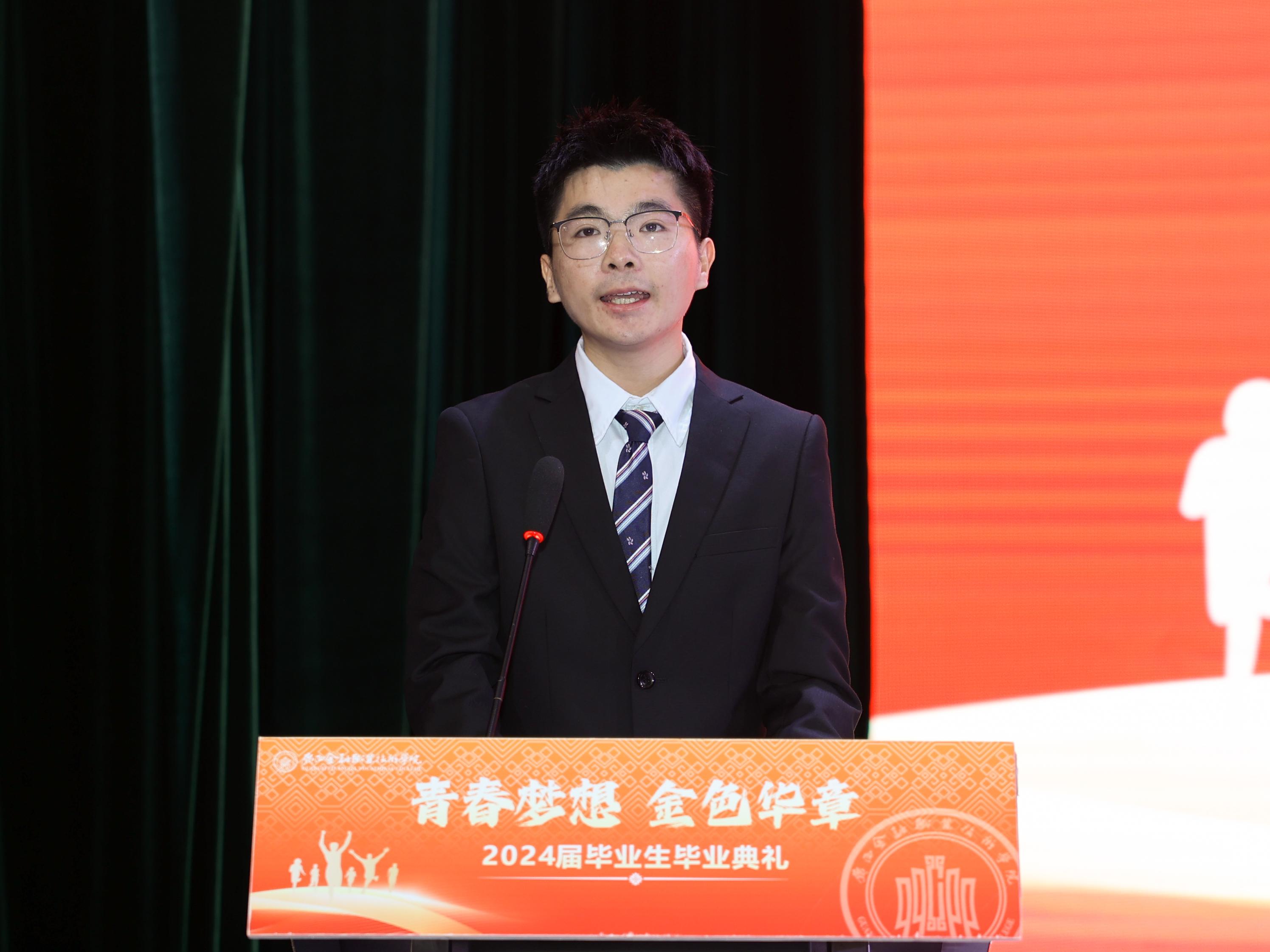 投资与保险学院教师廖玲玲作为教师代表发言,她寄语2024届毕业生,顺应时代的变化,不断学习进步,诚实守信,心怀感恩,做一个有理想抱负、有志气、有骨气、有底气的中国青年,在祖国需要的地方绽放绚丽之花。