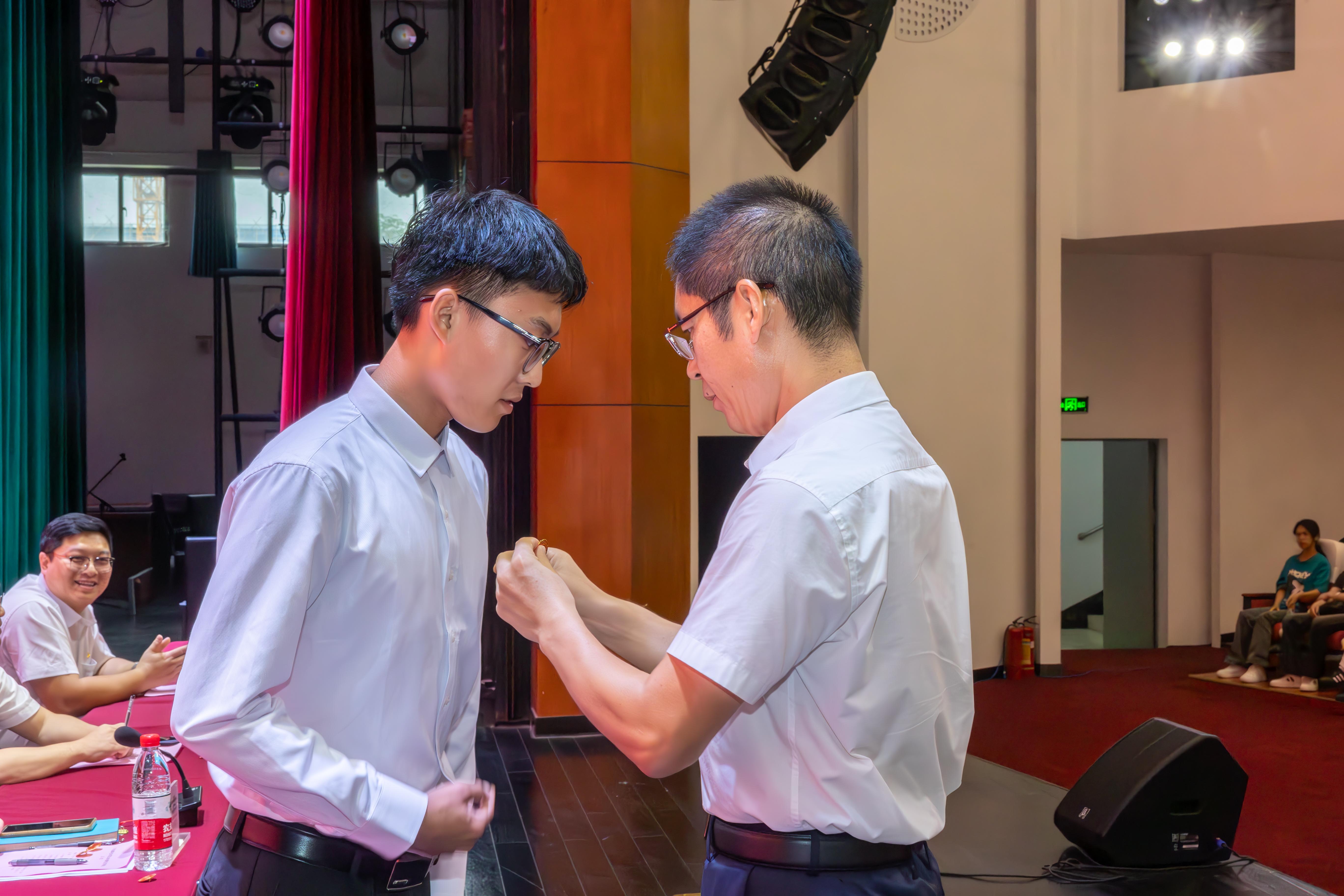 新生开学典礼上,气氛庄重而热烈。党委书记李高岩及出席典礼的各位校领导为学生代表们一一佩戴校徽。小小的校徽承载着金院的历史与荣耀,也象征着新同学们正式成为学校大家庭的一员。当校徽佩戴在学生代表们的胸前,全场响起热烈的掌声。这一温暖的举动,不仅是一种仪式,更是对新生们的殷切期望,激励着他们在未来的大学岁月里,努力拼搏,为校争光。