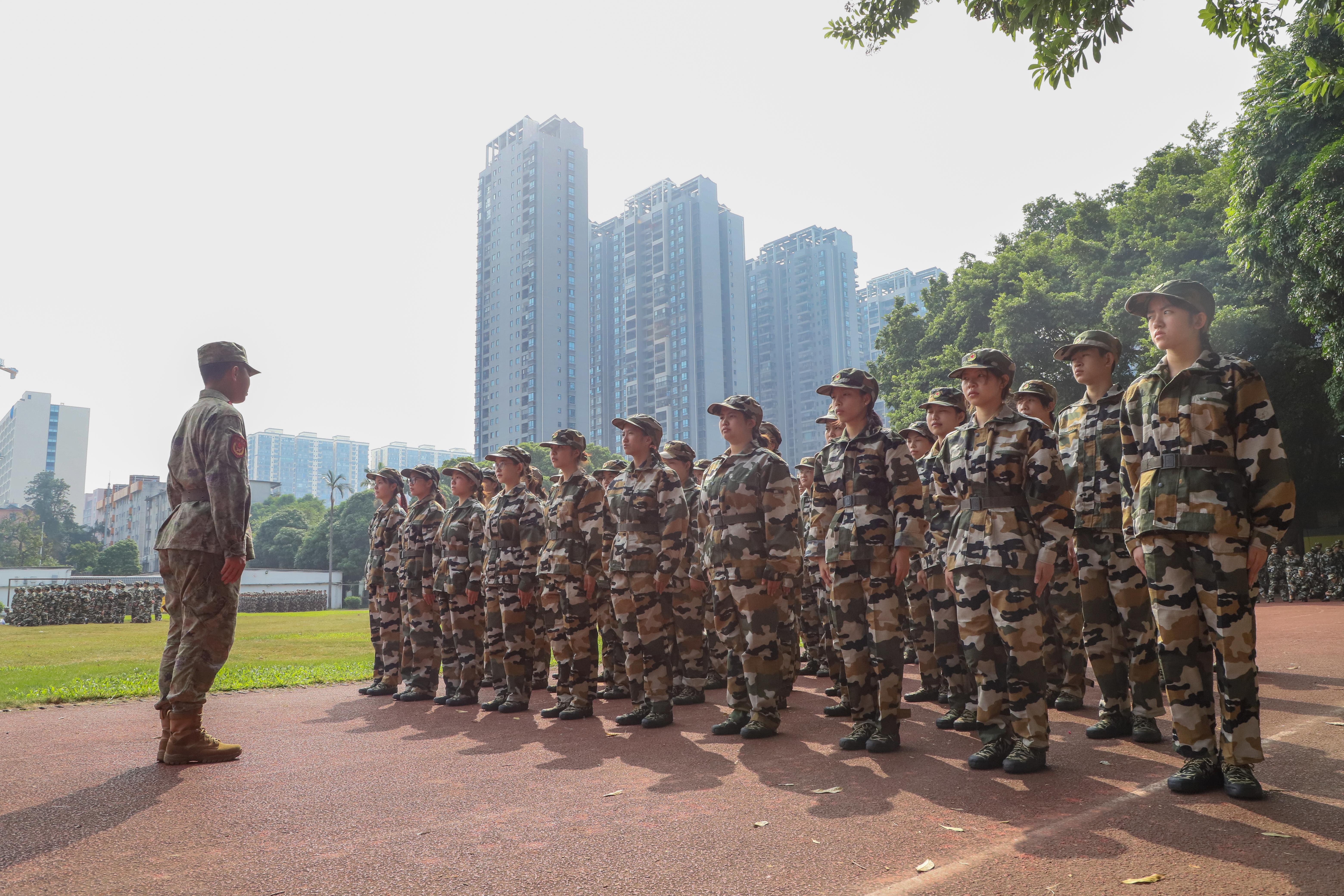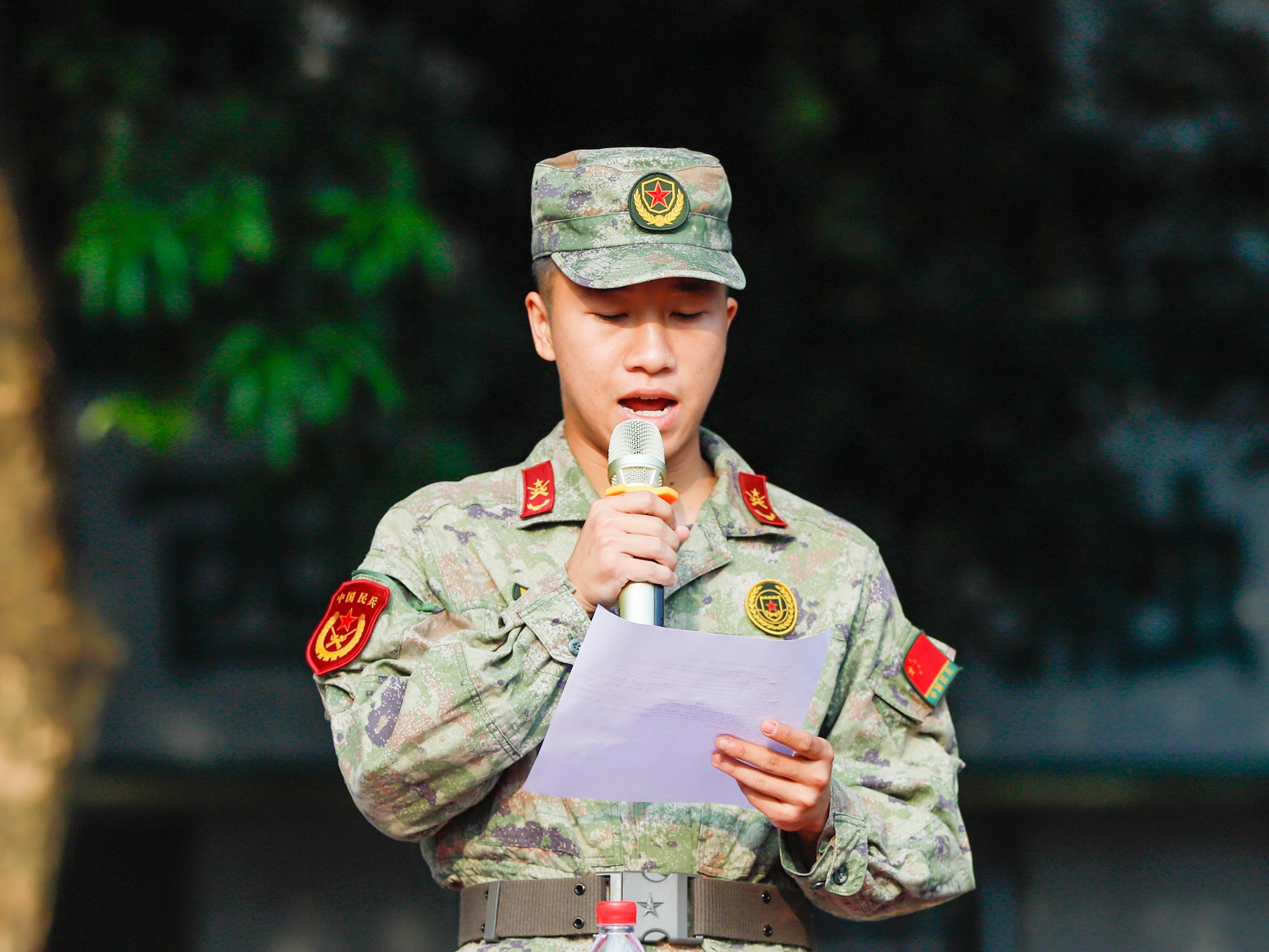 邕宁区人武部副部长韦文堂、军训总教官李金城在两校区讲话,要求本次军训新生遵守规定,严于律己,科学施练,配合工作,营造好教官与学生,学生与学生之间融洽的氛围,在军训中要以军人的标准严格要求自己,发扬不怕苦、不怕累的精神,挑战自我,超越自我。
