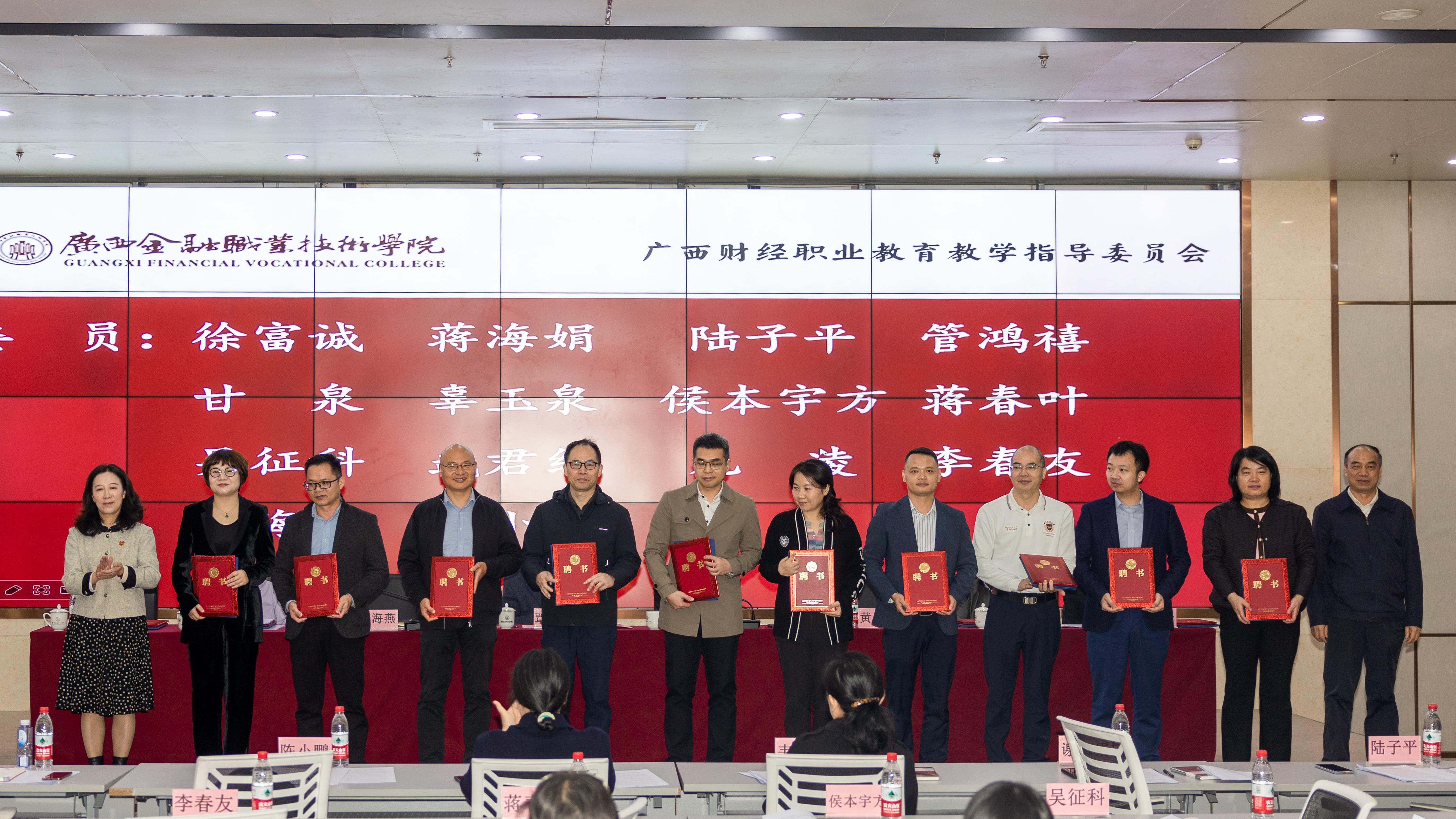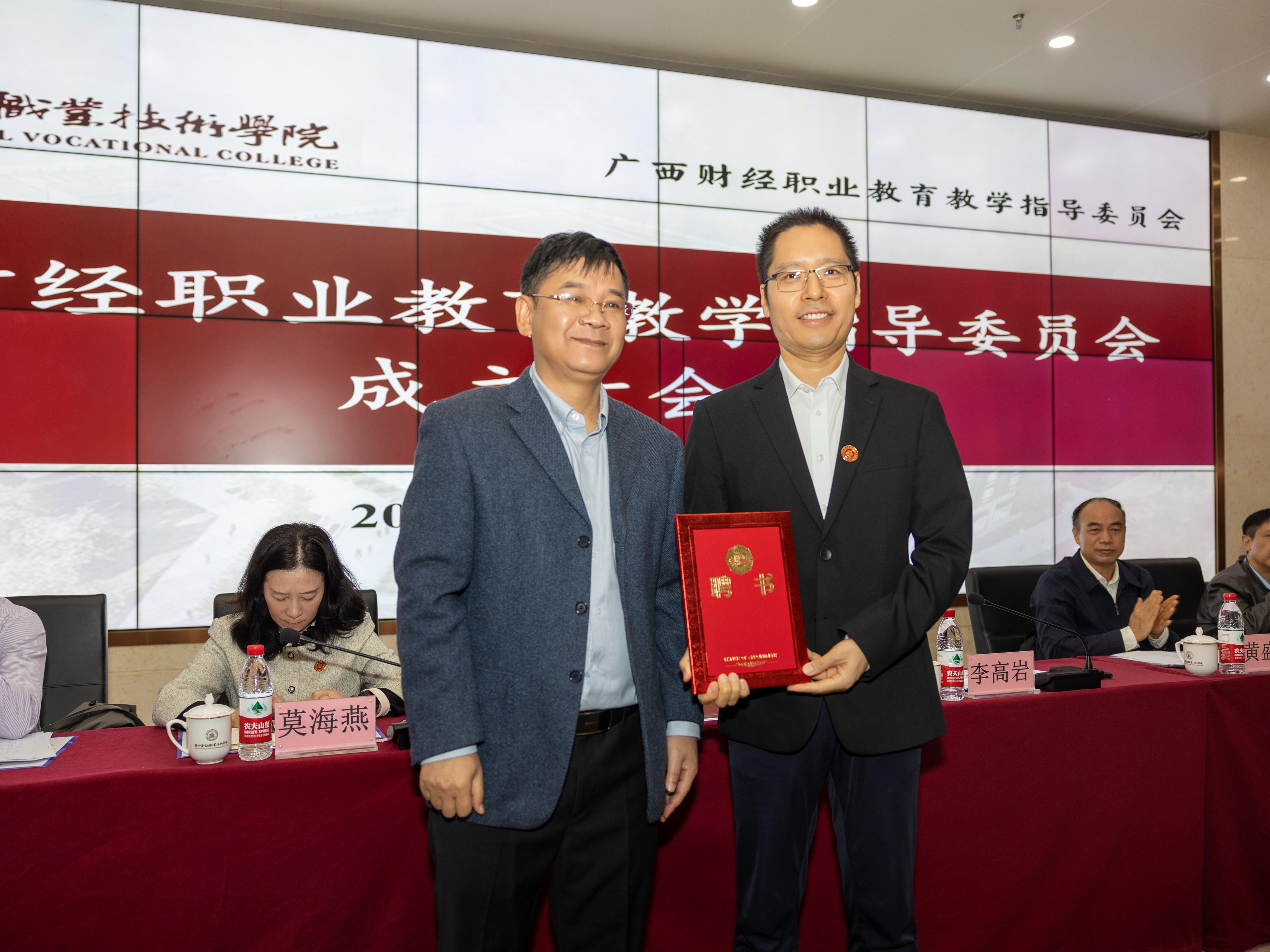 会议还进行了聘书颁发。覃壮才处长为主任委员颁发证书,李高岩主任委员为副主任委员、秘书长、副秘书长颁发了聘书,莫海燕校长及广西财经行指委五位副主任委员分别为委员颁发了聘书。