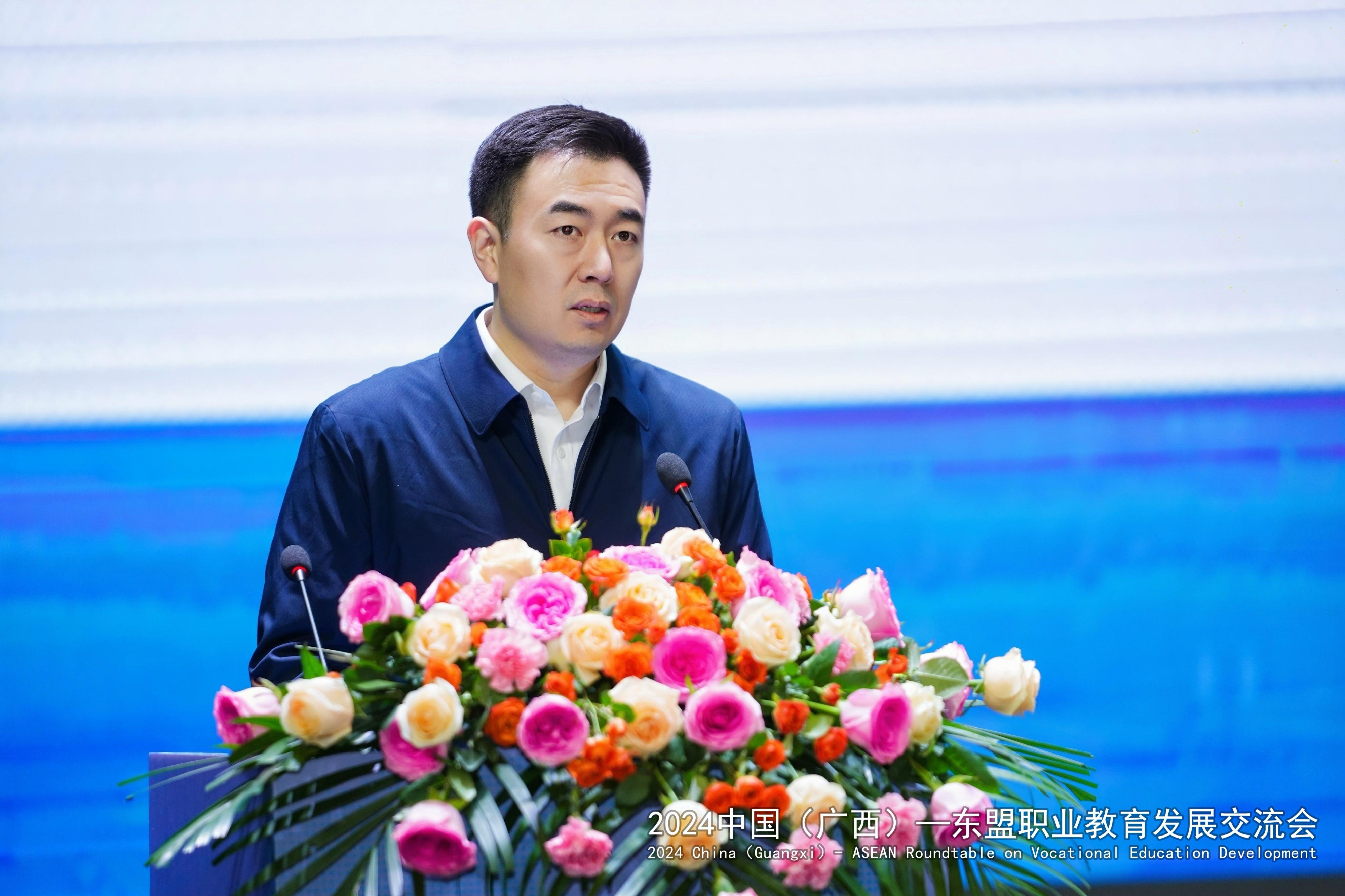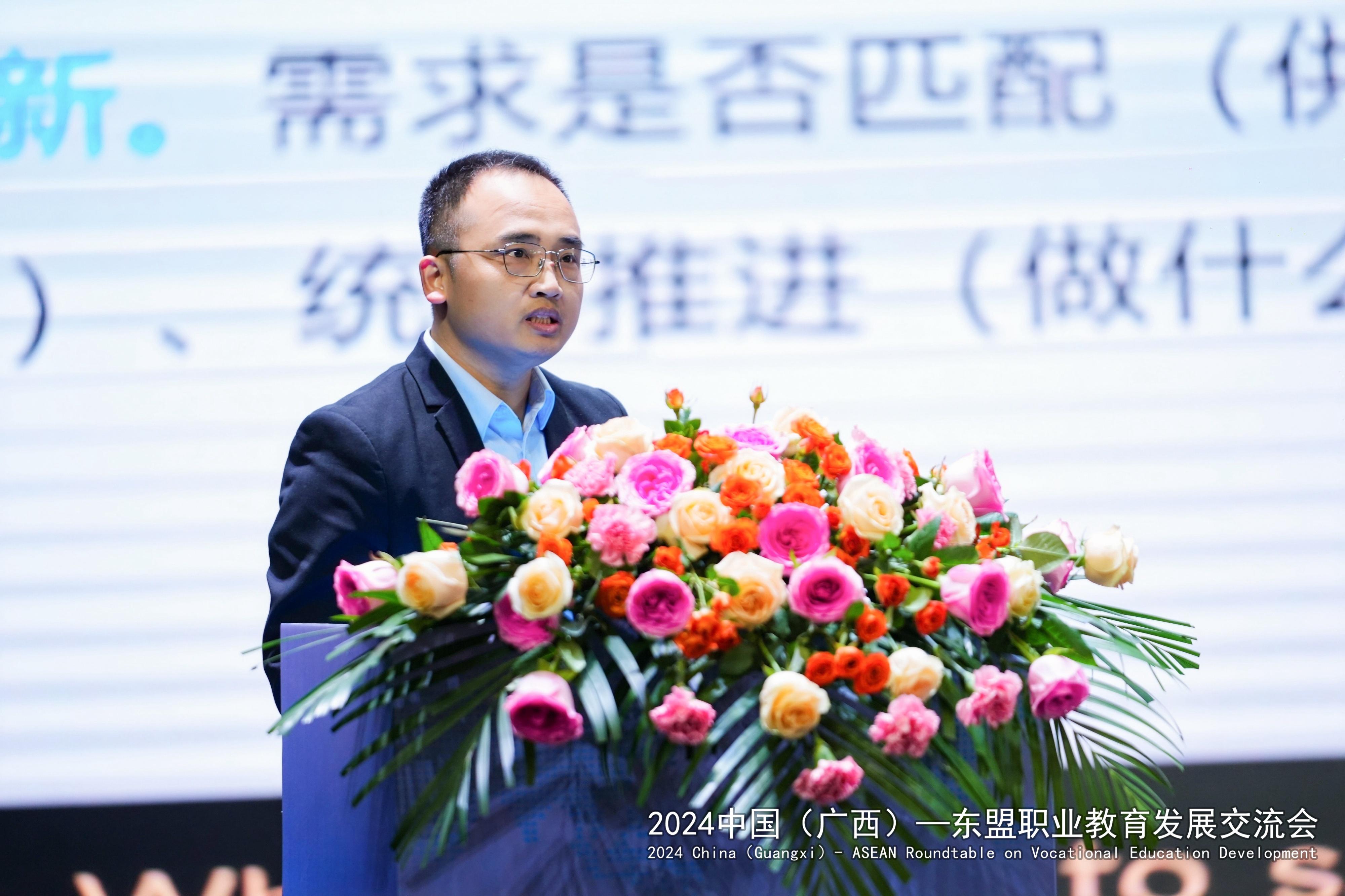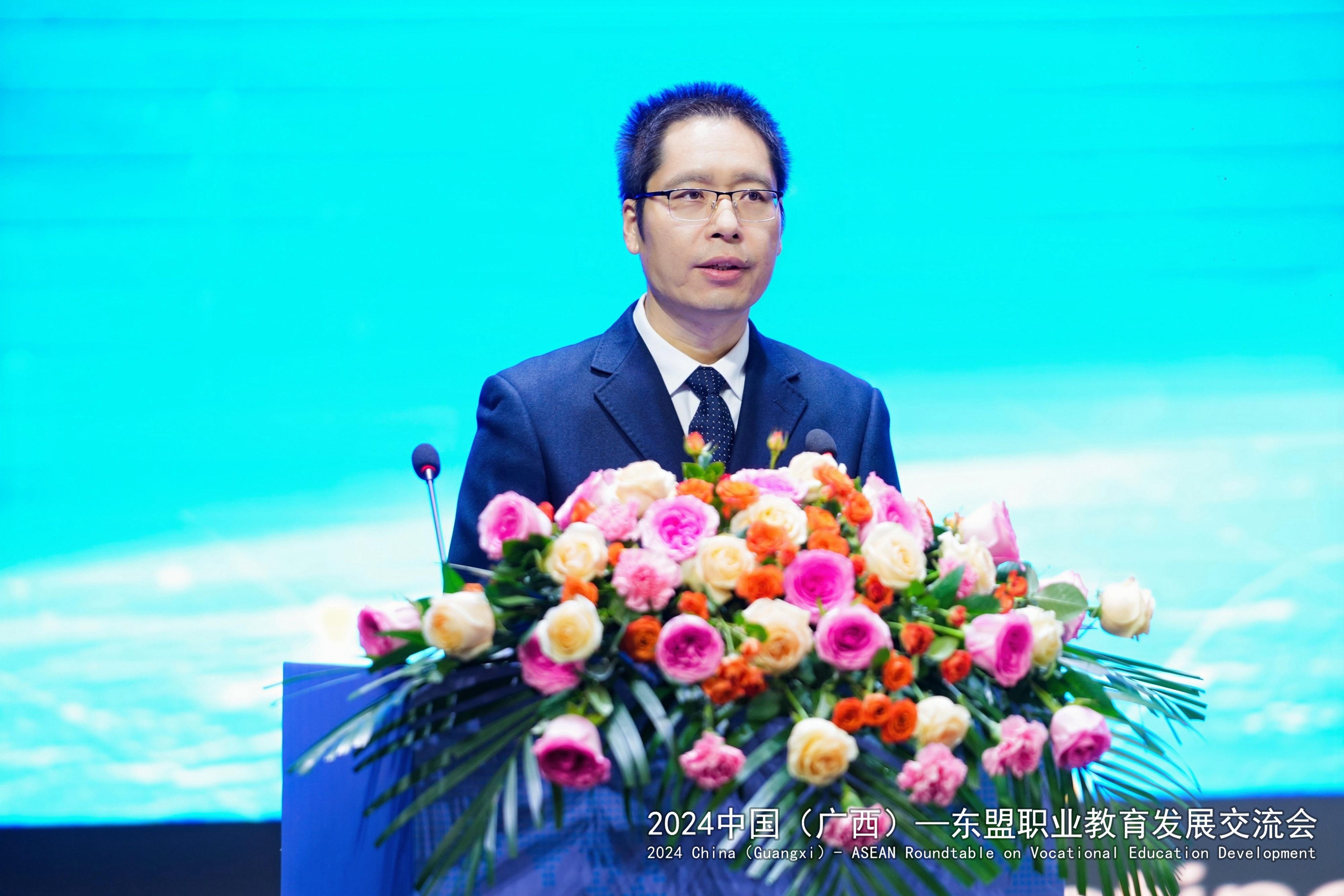 广西壮族自治区教育厅党组副书记、副厅长闫炳辰在讲话中指出,自治区教育厅积极响应“一带一路”倡议,把面向东盟开放合作摆在职业教育发展的重要位置。在面向东盟积极推进职业教育的开放合作与交流中,用心用力搭建沟通对话平台、用心用情拓展海外服务效能、用心用智搭建国际版人才培养立交桥、用心用爱为来桂留学生创造全域学习家园、用心用功持续探索教随产出、校企同行、产教共赢的广西职业教育国际化新模式。对于下一步推进中国广西与东盟的职业教育发展,闫炳辰提出了三点希望:一是希望进一步加强交流合作,优化中国(广西)—东盟国际化人才培养环境;二是希望通过加快改革创新,引领广西职业教育国际化高质量发展;三是希望不断加深山水情谊,搭建桂马、桂泰职业教育人文交流的友谊之桥。
