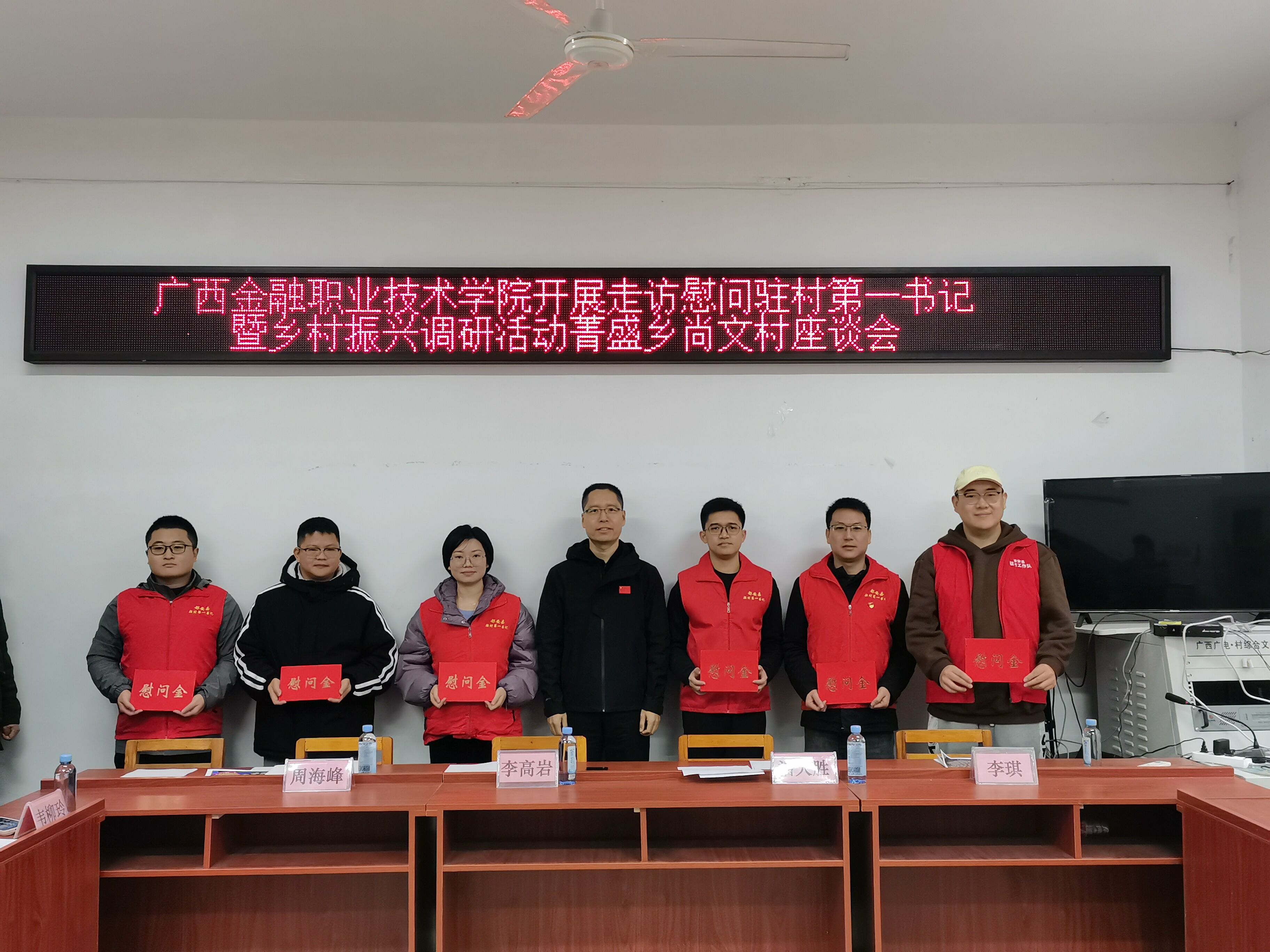 会上,李高岩书记为第一书记发放慰问金,听取2024年驻村帮扶工作汇报,与县、乡、村各级领导共同谋划2025年乡村振兴工作。潘莹宇副主任高度赞扬学校的结对帮扶成效,充分肯定了第一书记的驻村帮扶工作。蓝艳恒书记对乡村振兴具体业务进行了指导,与校领导就下一步结对帮扶工作进行了交流。