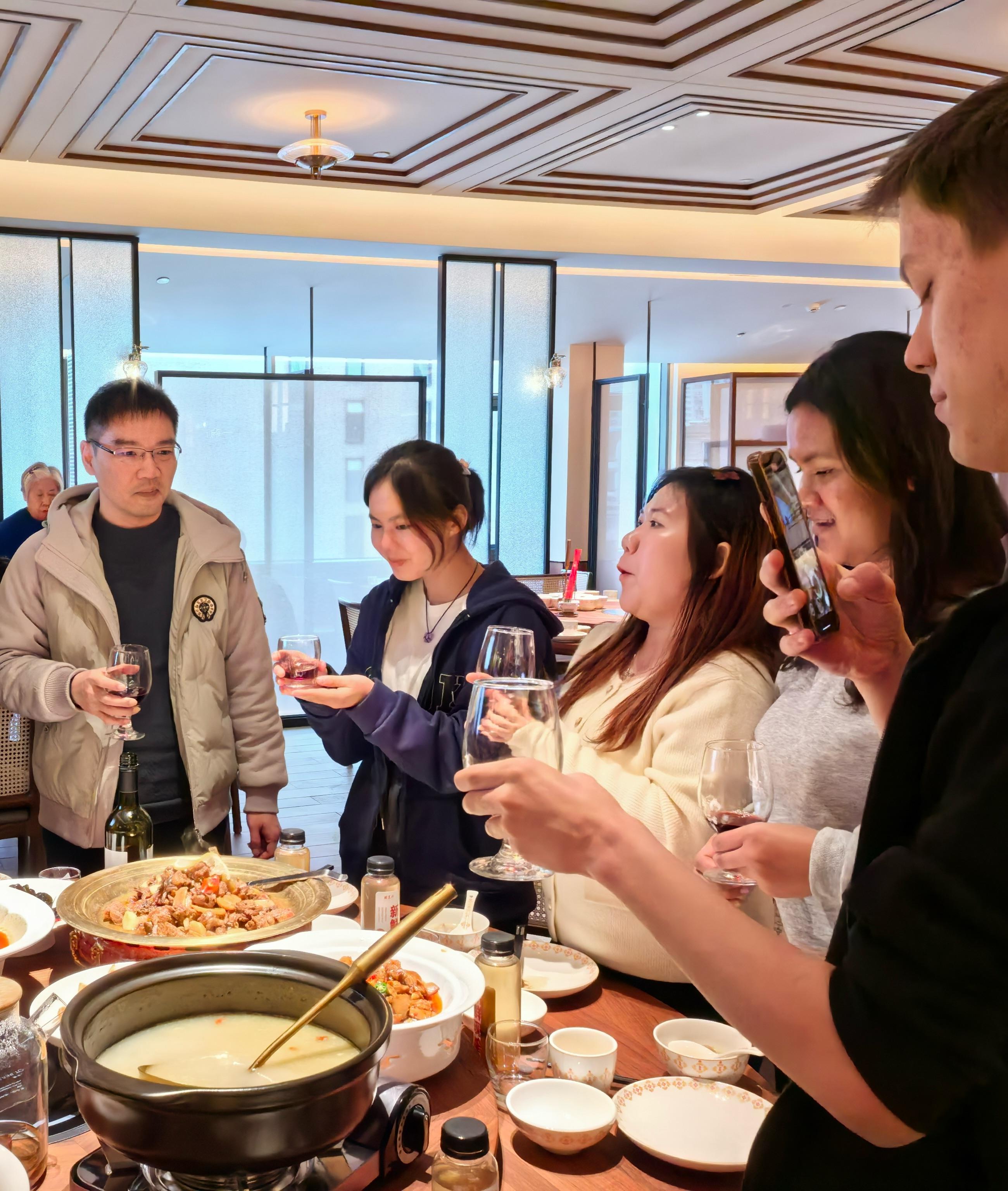 正月初六,学生们和张冠老师品尝当地特色传统火锅,大家围坐在一起,举杯相庆,互相祝福,传递浓浓的情谊。互赠春节礼物后,学生们踏上返校的归途,表示此次活动非常有意义,希望下次还能参加。