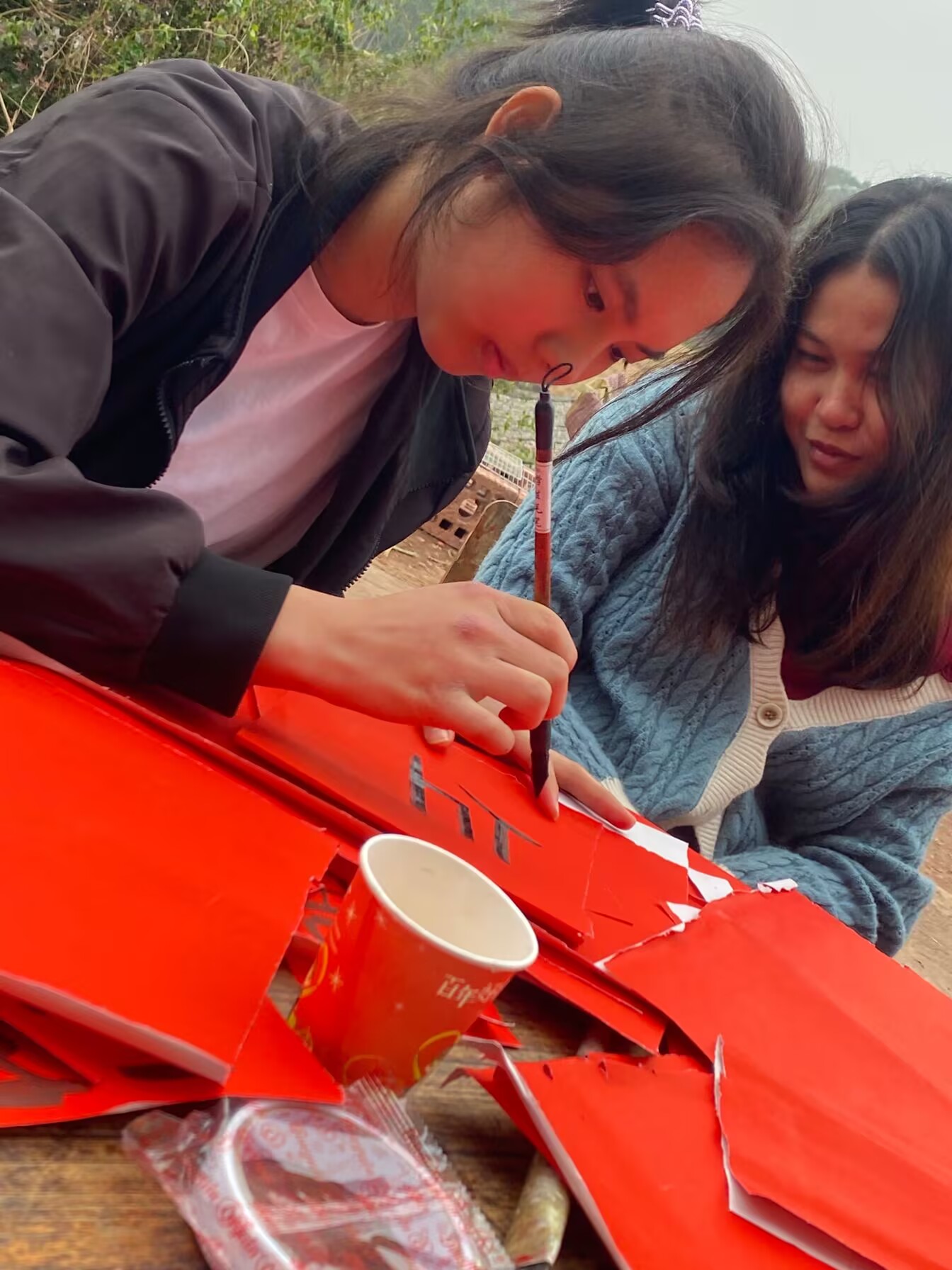 随后,大家来到张冠老师家中,体验和学习毛笔字的书写。在老师的耐心指导下,学生们手执毛笔,蘸墨挥毫,一笔一划地书写着汉字。红纸浓墨间,一个个形态各异的汉字跃然纸上,虽然笔触略显稚嫩,但每一个字都饱含着他们对中华传统文化的向往与崇敬,也寄托着对学校和老师的美好祝福。