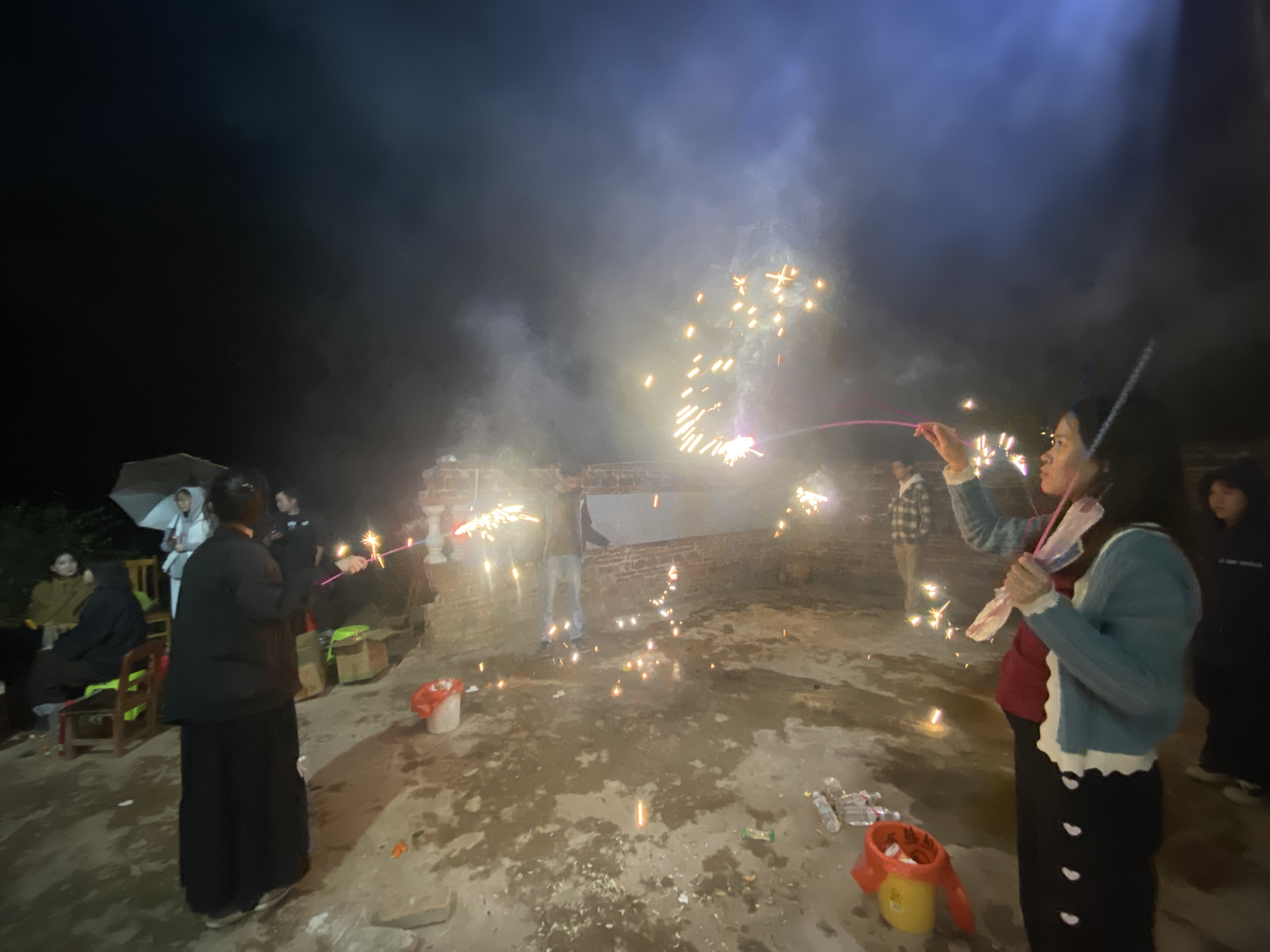 学生们在体验放烟花的乐趣