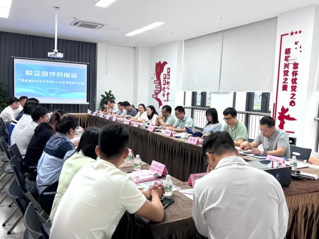 在广西(南宁)人力资源服务产业园、南宁市人力资源服务行业协会精心组织下,广西跑腿快车电子商务有限公司、广西四方汇通人才服务有限责任公司、南宁轨道数智科技有限公司、南宁市人力资源服务行业协会等13企业参与校企合作对接座谈会。在座谈会上,校企双方围绕“企业人才需求与高校人才培养的精准对接”主题展开深入交流。在人才培养方面,双方就“订单班”培养、实践教学资源开发等达成合作意向;在就业服务方面,重点探讨了实习就业通道搭建、“金融人才服务驿站”设立等创新举措。莫海燕校长表示,学校始终坚持以就业为导向办学,充分发挥学科专业优势,主动对接产业需求、优化人才培养模式,未来也将持续深化产教融合、校企合作,将党中央、国务院关于促进高校毕业生就业工作的部署要求落实为具体行动。