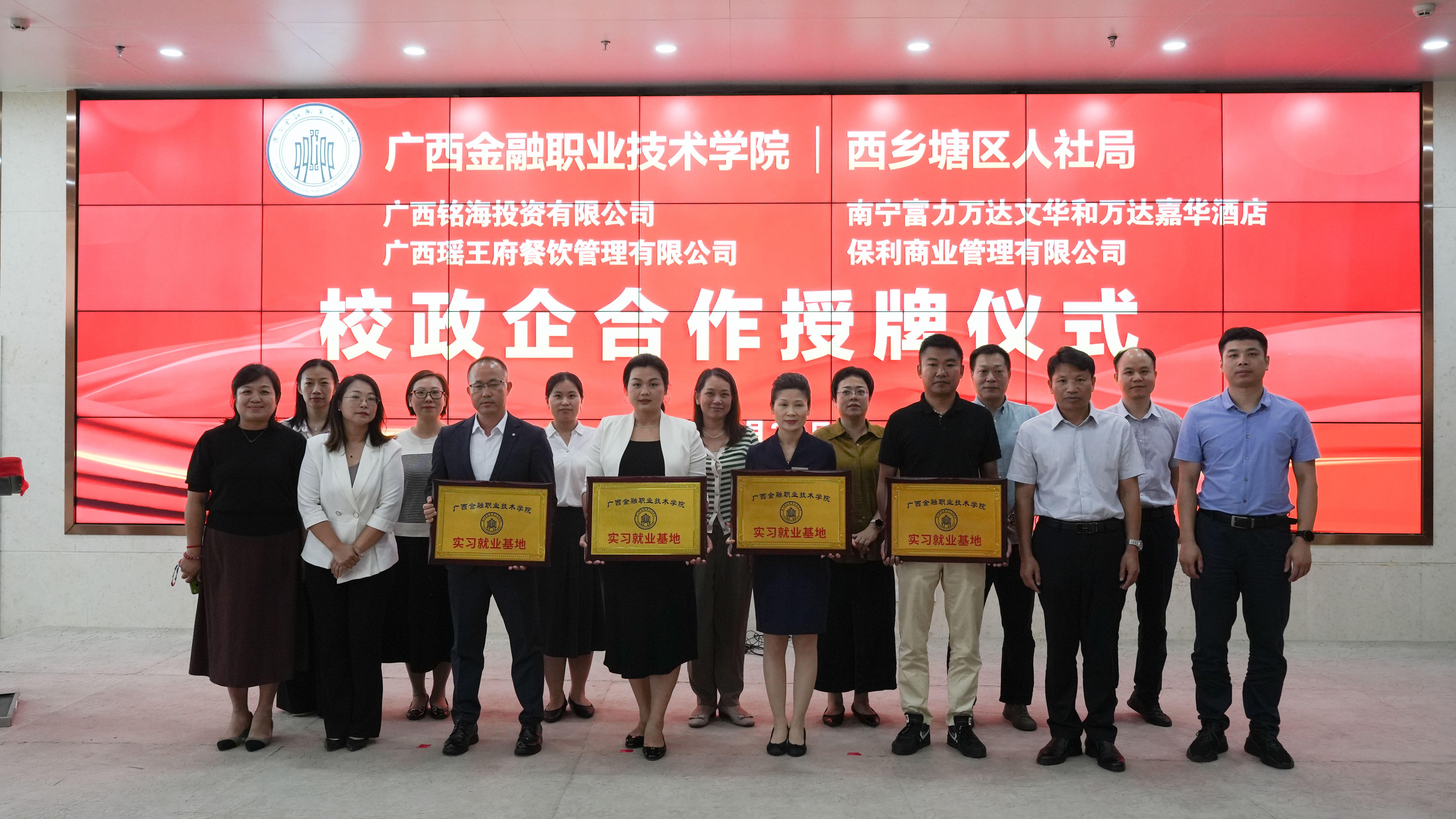 会上,刘华政副书记与苏岸芷局长还共同为广西铭海投资有限公司、南宁富力万达文华、南宁万达嘉华酒店、广西瑶王府餐饮管理有限公司和保利商业管理有限公司等5家单位授予校企合作牌匾,进一步加深了校政企合作。