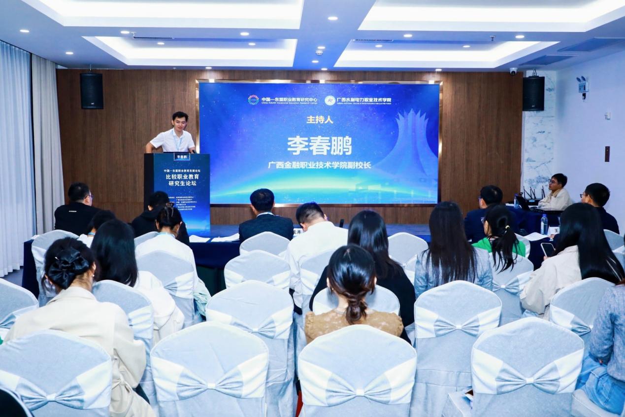 11月15日晚,“2025年中国—东盟职业教育发展论坛”平行论坛四——比较职业教育研究生论坛在南宁饭店锦绣楼5号厅举行。本次论坛由中国—东盟职业教育研究中心主办,伟德官网参与承办。论坛以“比较职业教育”为主题,意在为青年学者搭建交流平台,展示研究成果,共同探讨并深化对职业教育的认识与理解。论坛第一阶段由伟德官网副校长、广西重大人才项目承担者李春鹏主持。来自中国以及马来西亚、印度尼西亚、缅甸等东盟国家近千名代表齐聚一堂,分享职业教育领域的成功经验,共商职业教育的未来发展趋势。