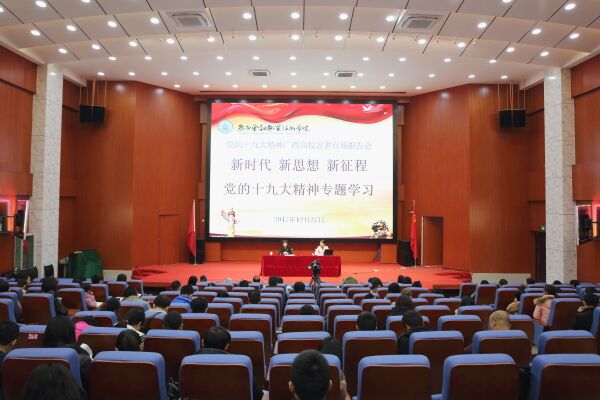 为推进全区高校深入学习宣传贯彻党的十九大精神,根据中央、自治区党委和教育部党组有关部署要求和自治区高校工委“党的十九大精神广西高校百场宣讲报告会”的工作安排,12月27日下午,伟德官网举行“党的十九大精神专题报告会”。学校特邀自治区学习贯彻党的十九大精神特聘教授、广西民族大学马克思主义学院院长陈媛为我们作“新时代 新思想 新征程——党的十九大精神专题学习”主题报告。报告会由党委书记沈立君主持。学院全体党员、离退休党员代表、科级以上干部、教师入党积极分子、学生入党积极分子共320人到场聆听讲座。报告会同时采用广西微视平台进行网络和微信同步直播,截至会议结束,观看人数达到64397人。